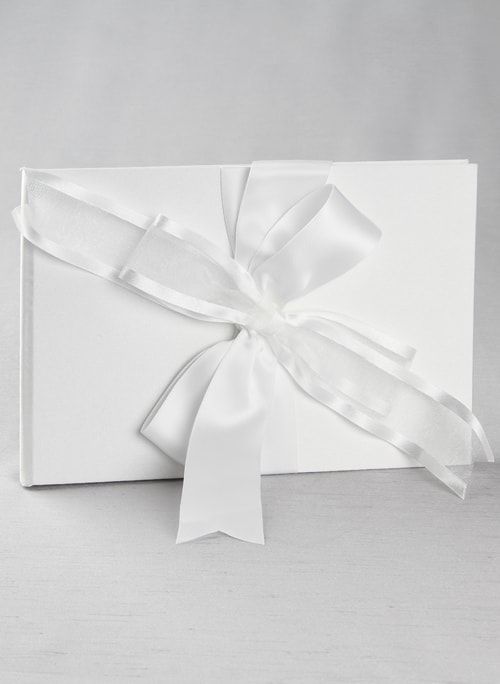 Classically simple design of smooth matte white satin wrapped with an organza and satin-edged bow. Available only in white. Guest book only, other items pictured sold separately.