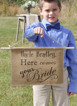 Announce the arrival of the bride with this personalized burlap sign. Customize this rustic sign with the groom's name printed in black ink on burlap fabric backed with natural colored canvas. The burlap and canvas are sewn together for stability although some fraying may occur at raw edges and is a natural part of the fabric and design. To complete the look, jute cording is tied onto a hardwood dowl rod. Please Note: The first line (Uncle Bradley) is custom. "Uncle" is not standard. It is pictured here as an example only.