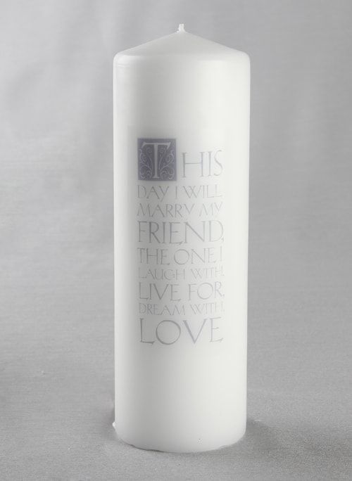This lovely wedding candle reads, "This Day I Marry My Friend the One I Laugh with Live for Dream with Love."