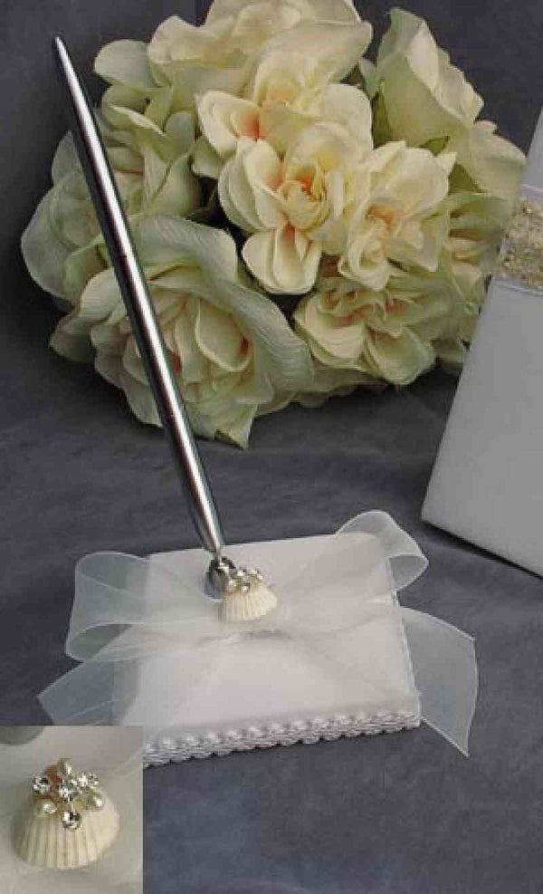 This elegant rhinestone shell Hawaiian beach wedding pen holder features an organza bow with a white shell accented with rhinestones and faux pearls. Pen holder made with satin. White pen holder comes with silver pen. Ivory pen holder comes with gold pen.