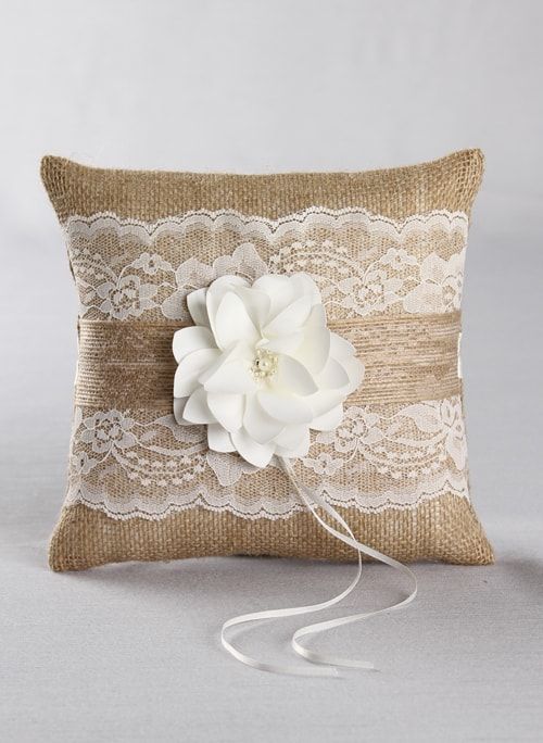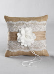 Rustic burlap fabric and delicate lace cover this elegant Ring Pillow. Layered jute ribbon and a pretty satin flower with a beaded center decorate this collection creating a soft romantic look.