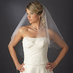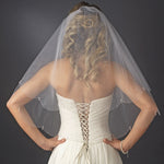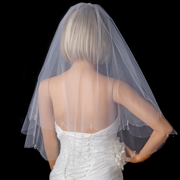 This intricate, double layer veil features a fine tulle of scalloped edges that are accentuated by dangling Austrian crystals, faux pearls and glass bugle beads along the borders. Family, friends, and guests are guaranteed to fall in love with this accessory!