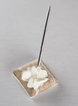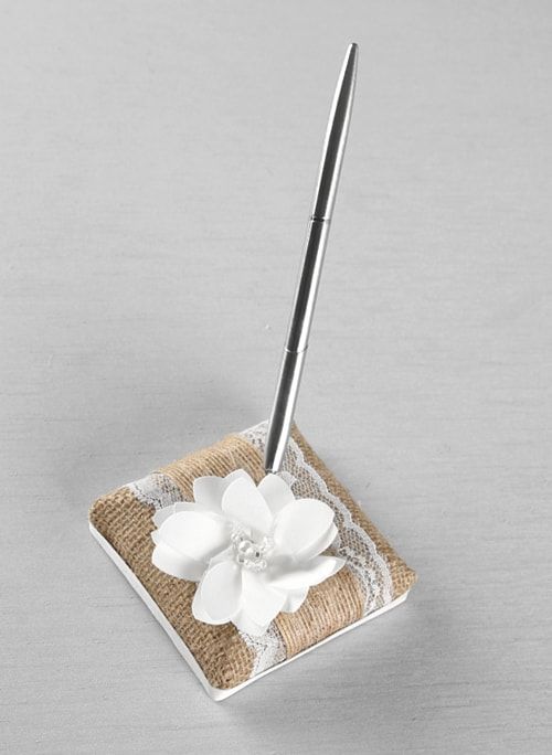 Rustic burlap fabric and delicate lace cover this elegant Pen Holder. Layered jute ribbon and a pretty satin flower with a beaded center decorate this collection creating a soft romantic look.
