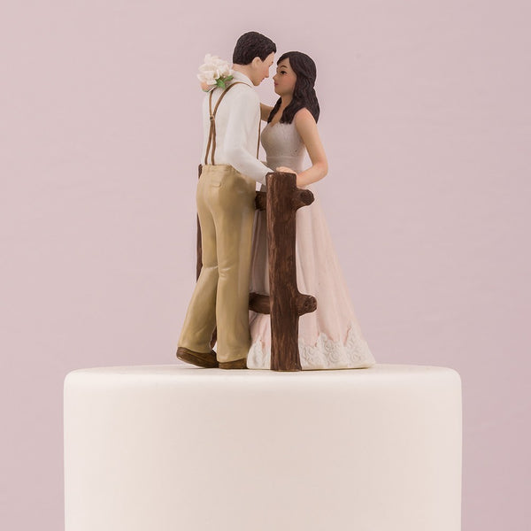 There’s something so alluring about country charm and this cake topper couple has all that and more. Leaning up against a rustic wooden fence gazing into each other’s eyes, this sweet couple will make a great addition atop your cake. A beautiful gown with delicate lace along the hemline, choose from a blush or white version of her dress. Hand sculpted, hand painted porcelain.